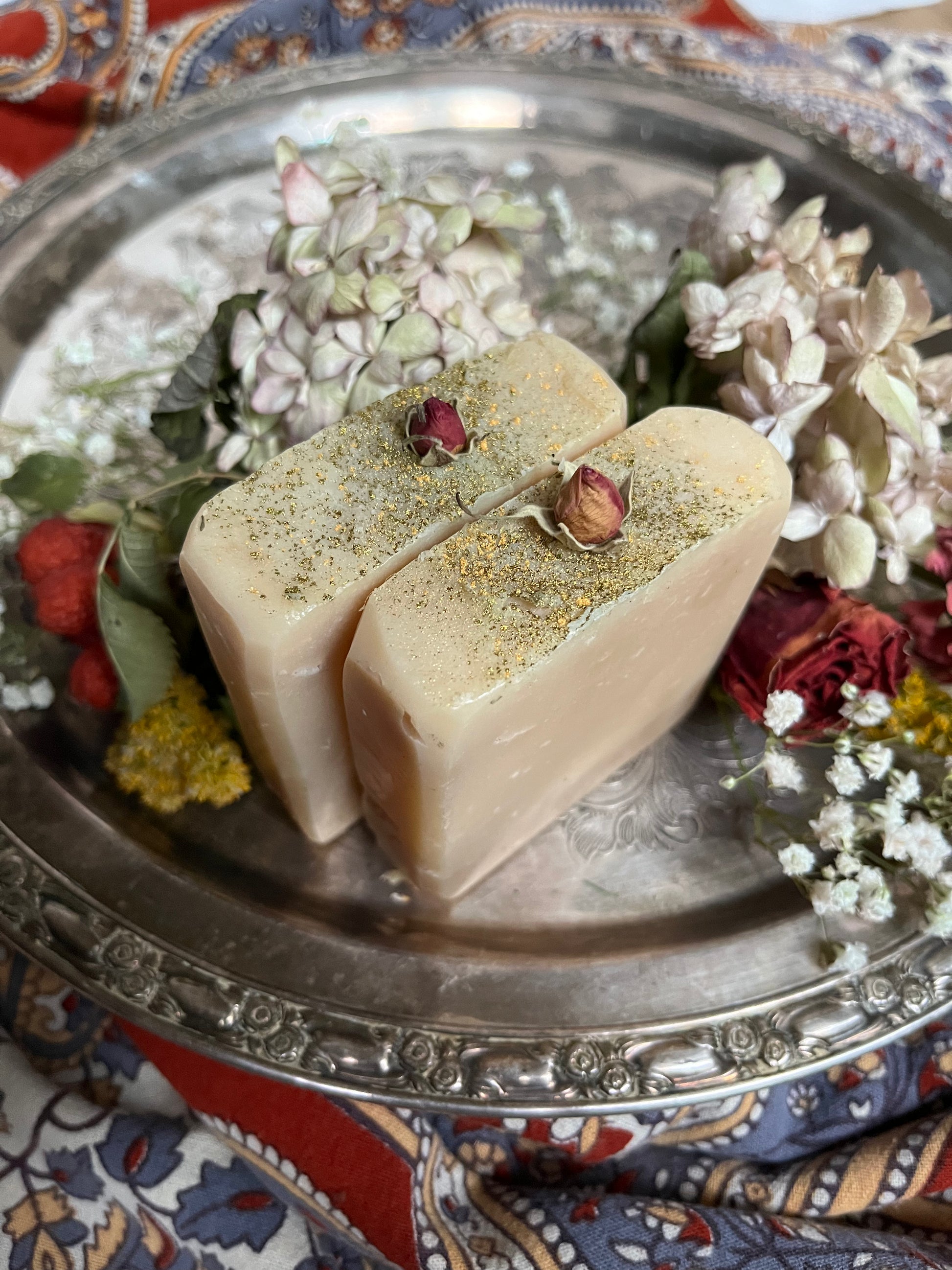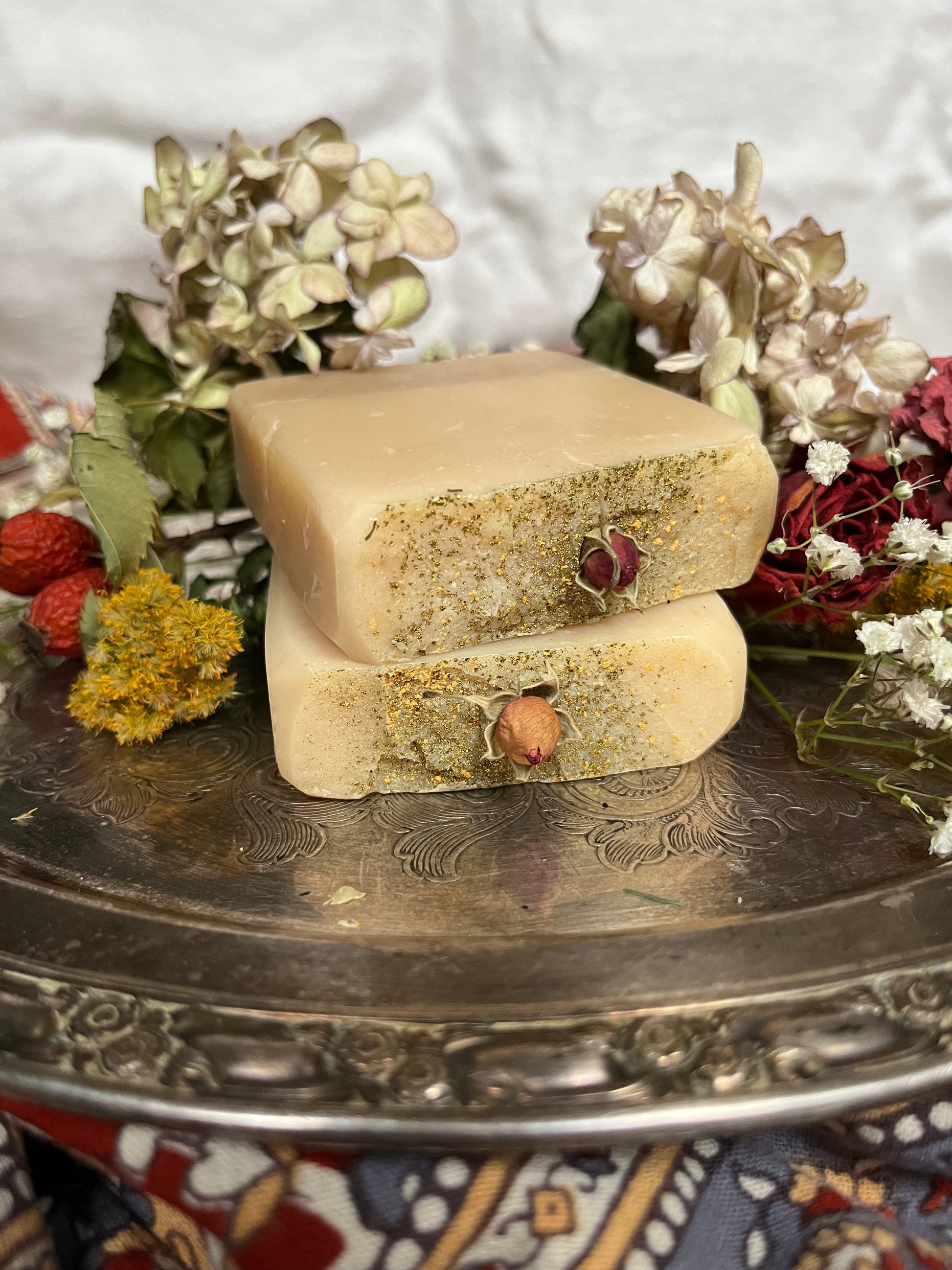 Your skin will love this luxuriously creamy bar. It’s extra nourishing, with lots of butters, local honey and organic coconut milk. This bar contains high quality fragrance oil in a dreamy milk and honey blend making it smell as lovely as it looks. But deep inside is where the real goodness lies, it also boasts Egyptian germanium essential oil, chamomile infused organic coconut oil, frankincense essential oil, and ylang ylang essential oil. Topped with a golden mineral mica and local Nootka rose buds.
