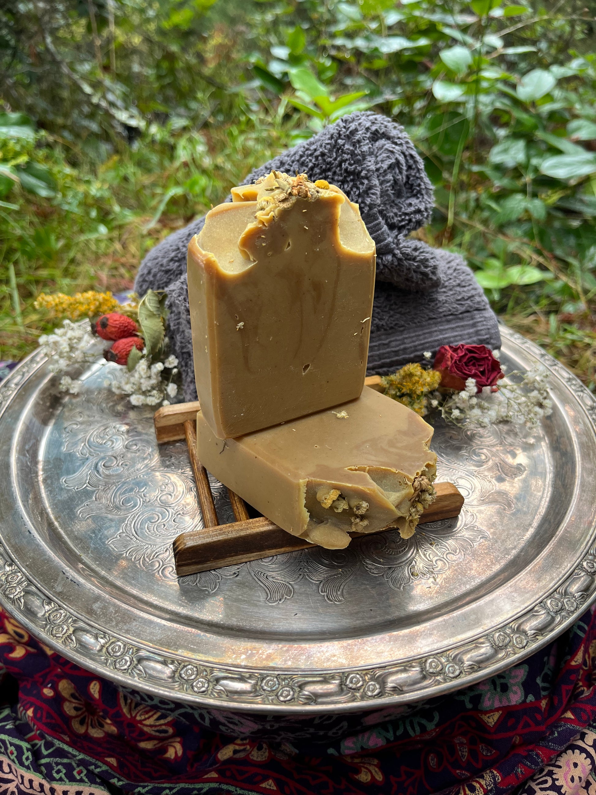 This lovely bar has only pure essential oils in it for scent, but it also boasts local chamomile and lavender flowers infused right into it for added benefits. Created with rich fats to create a gently cleansing and deeply nourishing bar that won’t leave your skin feeling dry. Safe for even the most sensitive of skin. Coloured with organic pea flower powder.