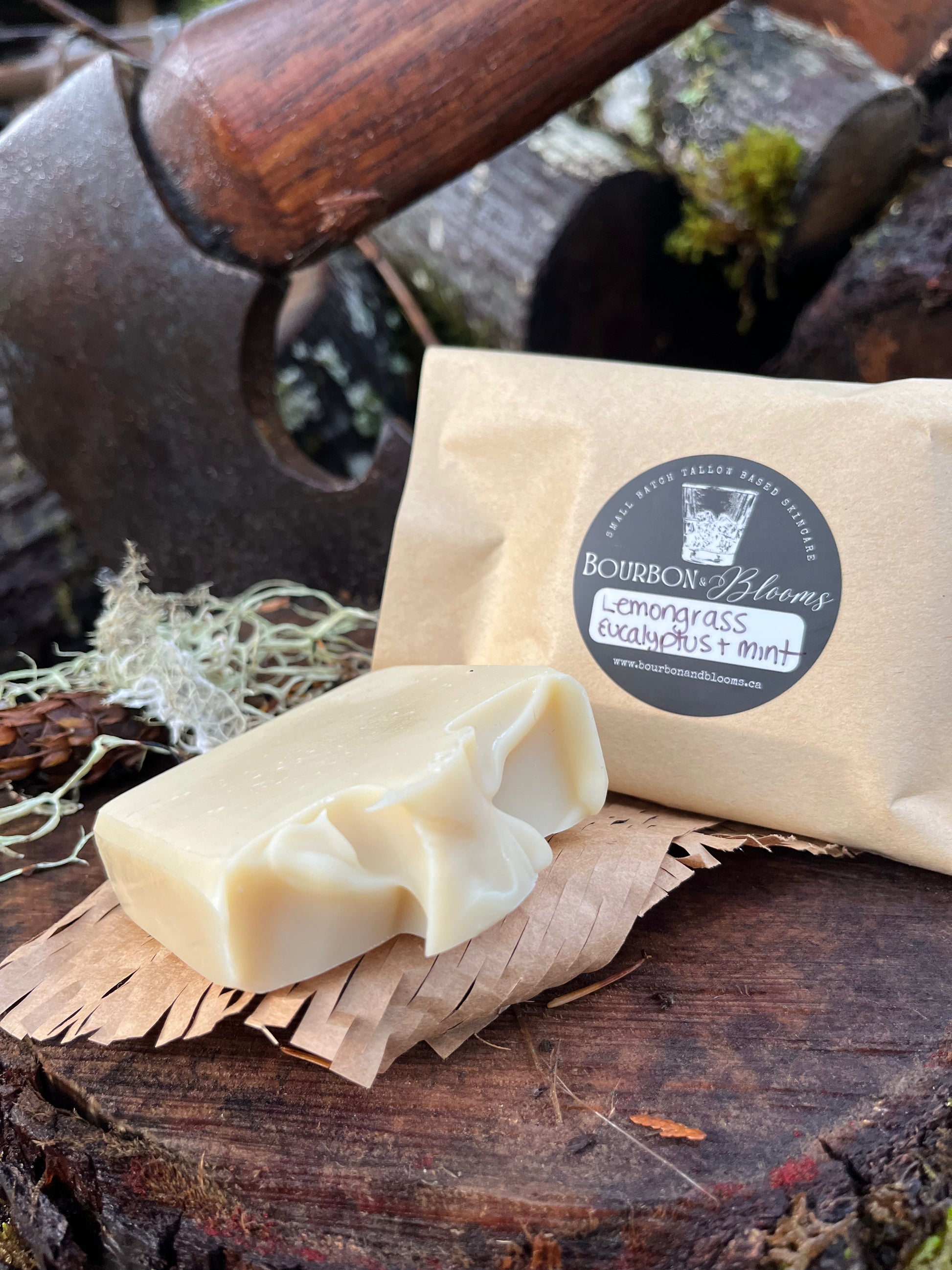 Ingredients: local tallow, organic olive oil, organic coconut oil, organic castor oil, rice bran oil, organic shea and cocoa butters, distilled water, sodium hydroxide, kaolin clay, essential oils of eucalyptus, lemongrass, and peppermint.